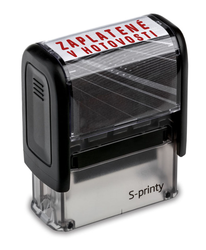 Ukázka otisku 1:1 S PRINTY 4911/SK "ZAPLATENÉ V HOTOVOSTI" Rozměr otisku: 38 x 14 mm Běžná cena: 224 Kč Vaše cena: 213 Kč Vložit do košíku Samobarvicí razítko s textem. Příklad otisku 1:1